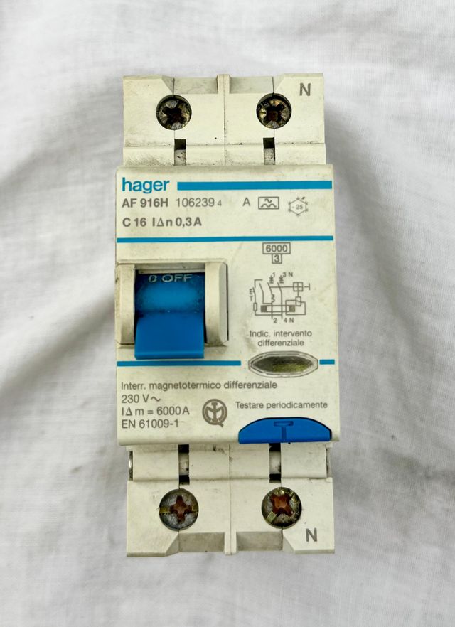 Dettagli del prodottoINTERRUTTORE DIFFERENZIALE MAGNETOTERMICO SALVAVITA HAGER AF 916H - C16 0.3A