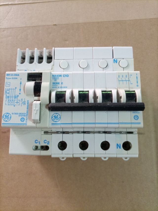 Interruttore quadripolare magnetotermico/differenziale ad alta sensibilità (Idn=0,03A) In 10A nuovo mai usato GE con bobina di sgancio C1 C2