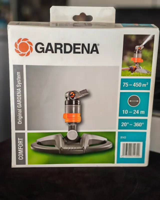 Irrigatore a turbina Gardena modello Comfort, ideale per il giardino. - Copertura: 75-450 m² - Gittata: 10-24 m - Angolo di irrigazione: 20°-360°