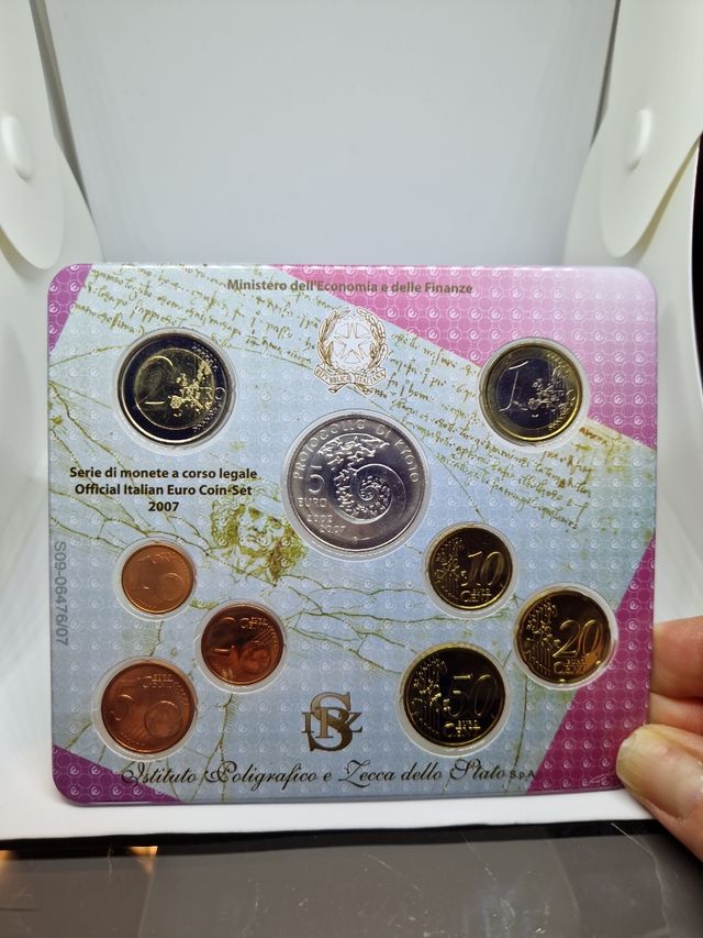 Vendo serie divisionale italiana anno 2007 composta da 9 monete fra cui i 5 euro argento 925 18 gr. Fior di conio.