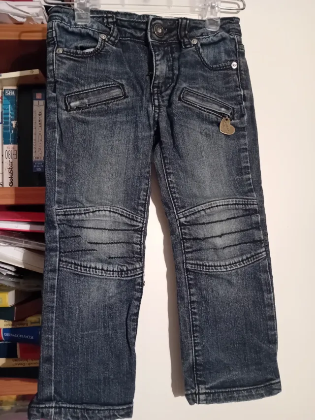 Dettagli del prodottoJeans per bambina in denim effetto used. Presentano dettagli con zip e un piccolo ciondolo a forma di cuore.