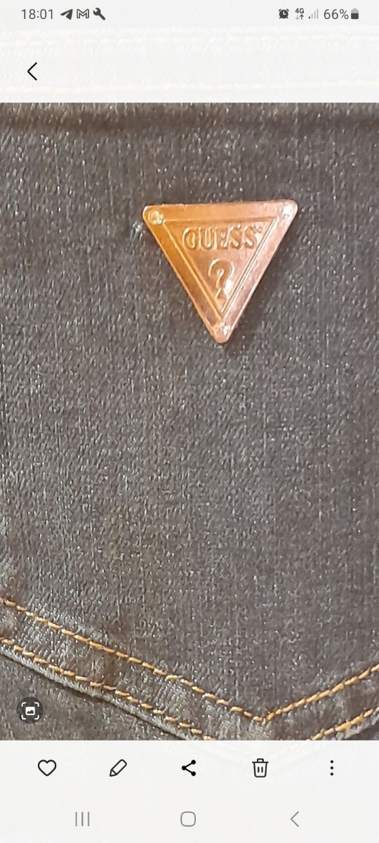 Jeans Guess a zampa di elefante, taglia 12 anni. - Logo Guess a forma di triangolo. - Cuciture a vista color cuoio.