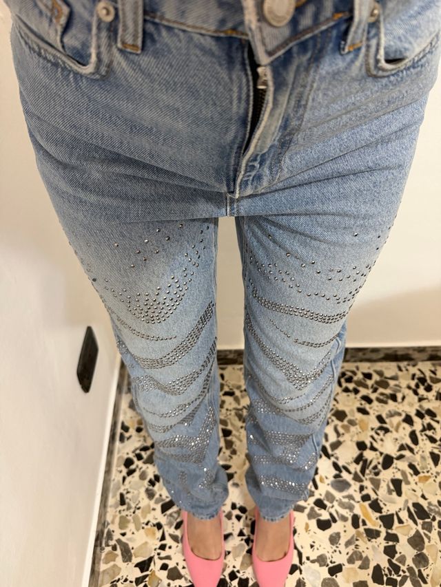Jeans Mom Fit con Strass Argento