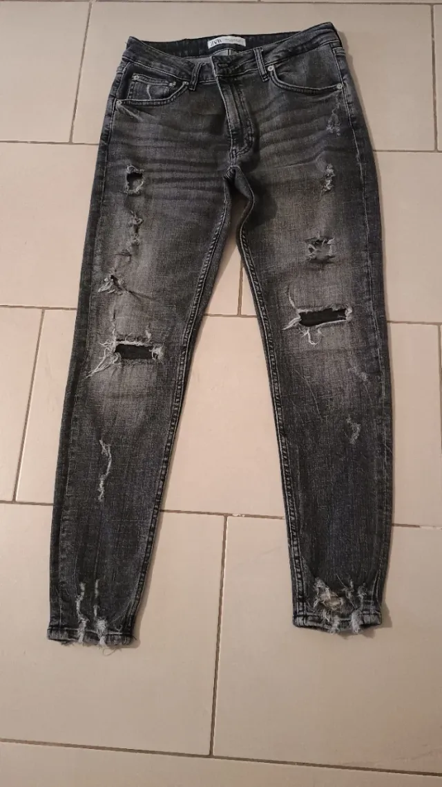 Jeans dal lavaggio grigio scuro con dettagli strappati.