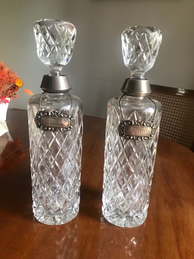 Dettagli del prodottoElegante set di due bottiglie in cristallo intagliato con dettagli in argento, che rievocano lo stile degli anni '60. Perfette per collezionisti o per aggiungere un tocco vintage alla tua casa. - Bottiglia di cristallo intagliato con design a rombo. - Tappo di cristallo intagliato. - Collarino e etichetta in argento. - Etichette con iscrizioni Whisky e Cognac. La descrizione è stata tradotta automaticamente.
