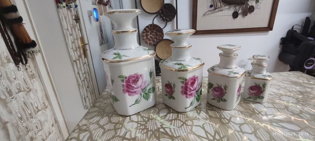 Dettagli del prodottoElegante set di quattro bottiglie di profumo antiche del marchio Montseny. Sono realizzati in porcellana bianca con delicate rose dipinte a mano e dettagli dorati. Ideale per decorare o collezionare.