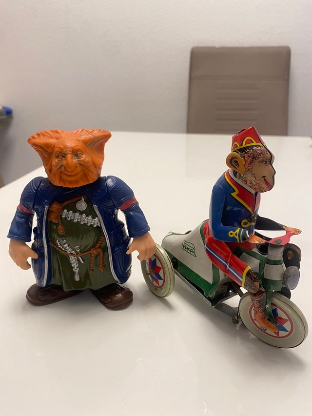Set di due giocattoli antichi. - Personaggio di Masters of the universe - Scimmia di latta in sella a una moto.