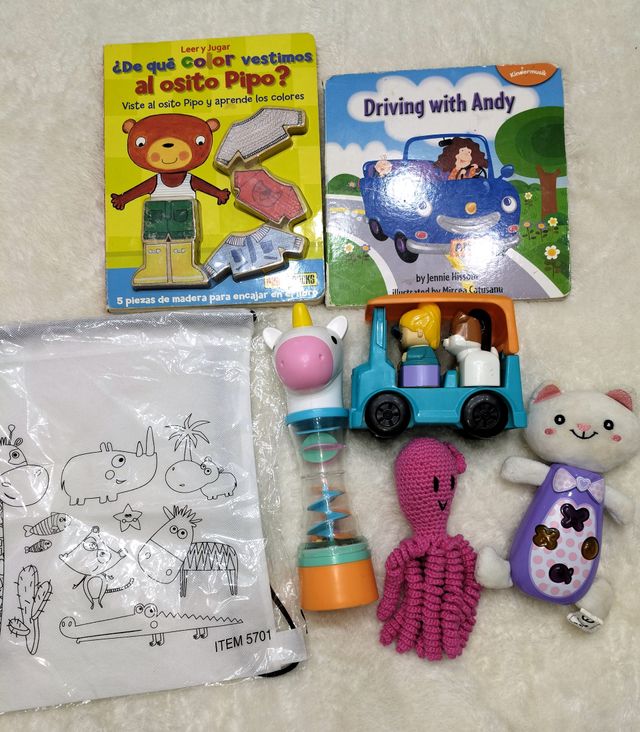 Dettagli del prodottoSet di giocattoli per bambini. È composto da un gatto di peluche con pulsanti luminosi e sonori, un sonaglio unicorno con smerigliatrici, un nuovo zaino per animali, un polpo rosa, un camion dell'autobus con quattro bambole rimovibili, un libro con pezzi di legno per insegnare i vestiti e un libro in inglese per le prime parole. In buone condizioni Prezzo per set. La descrizione è stata tradotta automaticamente.