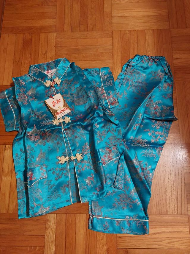 Dettagli del prodottoPigiama in stile kimono per bambino/a di 2 anni. Realizzato in tessuto satinato con una bellissima stampa floreale e draghi.