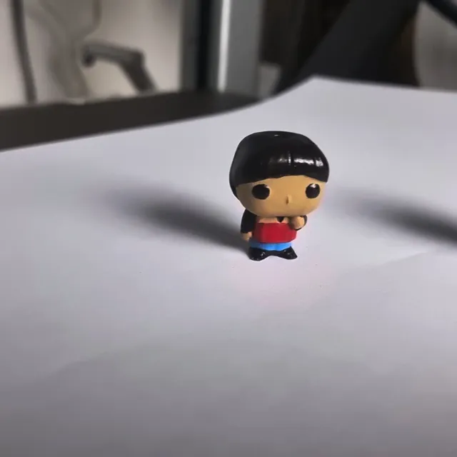 Personaggio da collezione Kinder Joy. Riproduzione nei minimi dettagli Design 3D. - Personaggio con capelli neri, maglia rossa e pantaloncini blu.