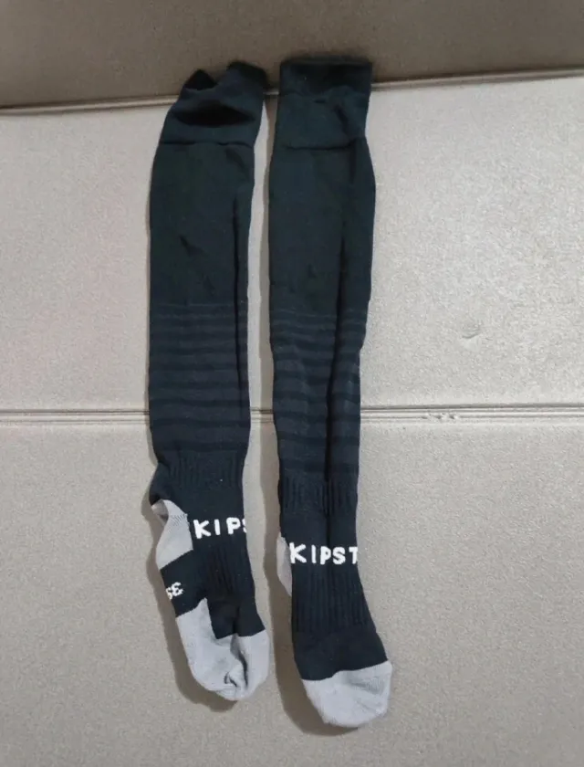 Calzini lunghi Kipsta per calcio, taglia 39-42. - Colore nero con dettagli grigi. - Logo Kipsta visibile.