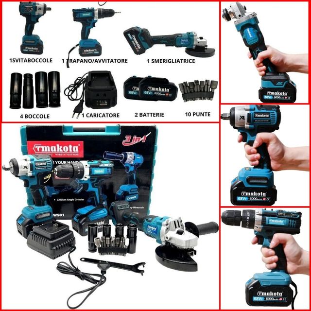 Dettagli del prodottoKIT 3in1 Trapano Avvitatore e Smerigliatrice a batteria 68V, trapano ad impulsi svita bulloni flex professionale portatile con motore brushless, valigetta inclusa