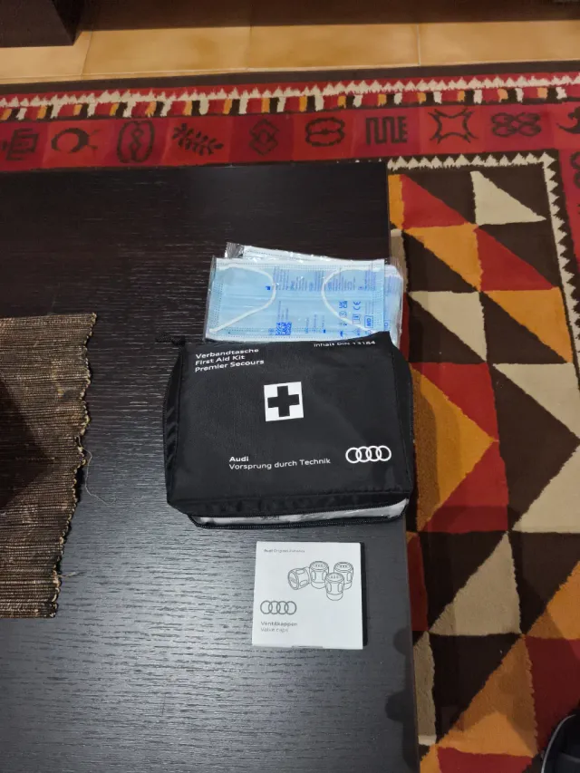 Kit di pronto soccorso e tappi per valvole originali Audi. - Borsa pronto soccorso con croce bianca. - Tappi per valvole con logo Audi.