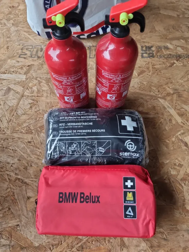 Kit de primeros auxilios y seguridad para vehículos BMW. - Kit de primeros auxilios BMW Belux. - 2 extintores rojos. - Homologado según la norma DIN 13164-2014.