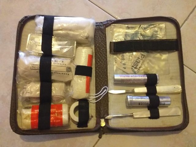 borsetta in pelle richiudibile completa di garze vasellina e prodotti per il primo soccorso.