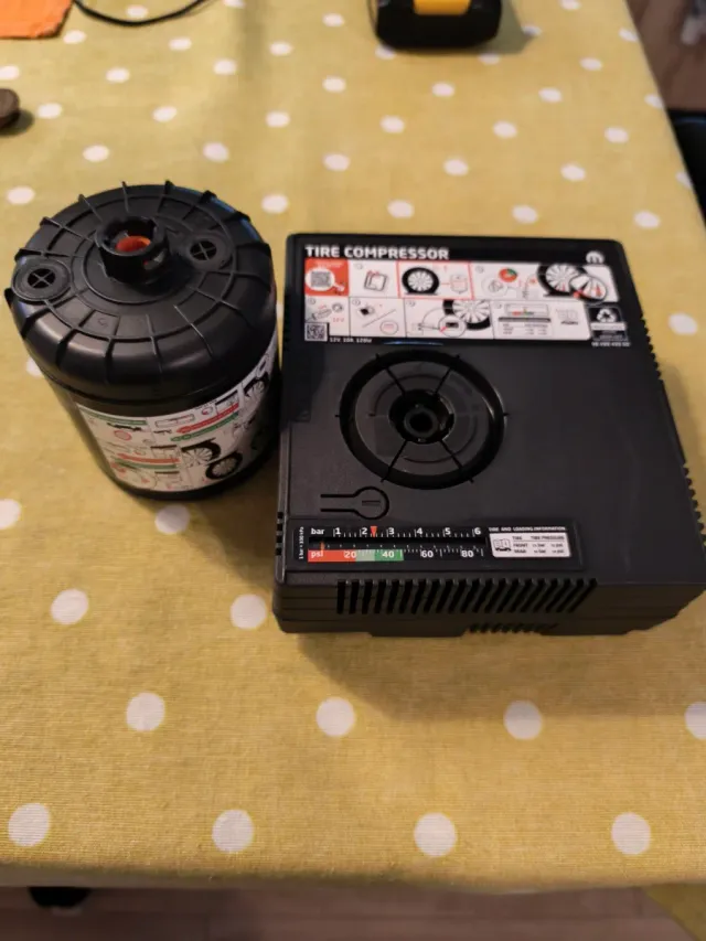 Kit di riparazione per pneumatici con compressore integrato. - Compressore 12V. - Manometro per controllo pressione. - Tubo flessibile per gonfiaggio.