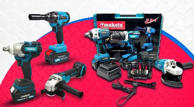 Kit tmakota composto da trapano avvitatore + smerigliatrice angolare + avvitatore ad impulsi in comoda valigia di plastica incluse 2 batterie da 68v caricatore, impugnatura per flex.