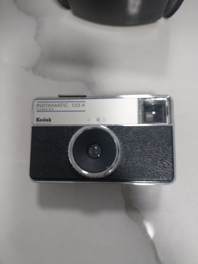 Macchina fotografica vintage Kodak Instamatic 133-X. - Design classico con finiture argentate e nere. - Obiettivo rotondo al centro.