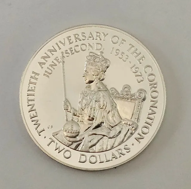 - Dritto: TWENTIETH ANNIVERSARY OF THE CORONATION, JUNE SECOND 1953 - 1973, JB, TWO DOLLARS.