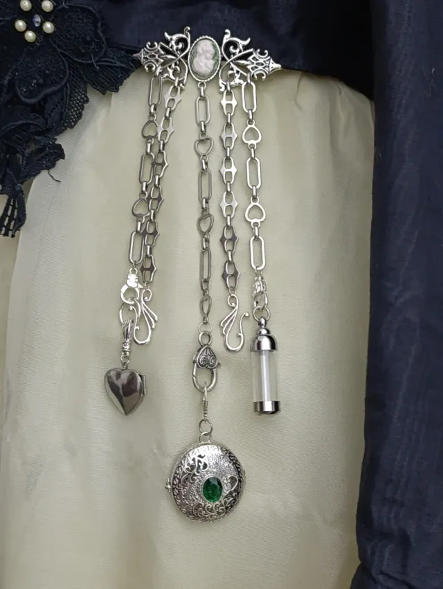Dettagli del prodottoBellissima chatelaine accessoriata con lacrimatoio in stile vittoriano in vetro, scatolina porta oggetti e ciondolo porta foto
