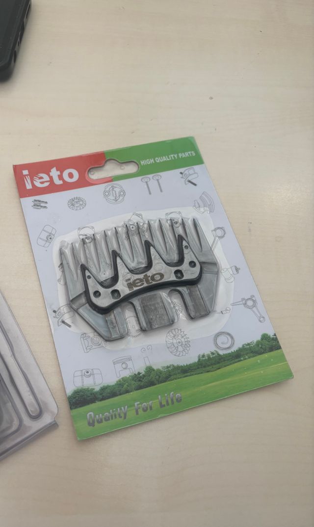 Set di lame di ricambio per tosapecore marca IETO. - Lame in metallo con design a pettine. - Logo IETO impresso al centro. - Bordatura in gomma nera.