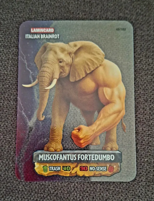 Lamincard della serie Multiverse. - Italian Brainrot - Numero 43/162 - Muscofantus Fortedumbo - Trash 40 - No-Sense 90