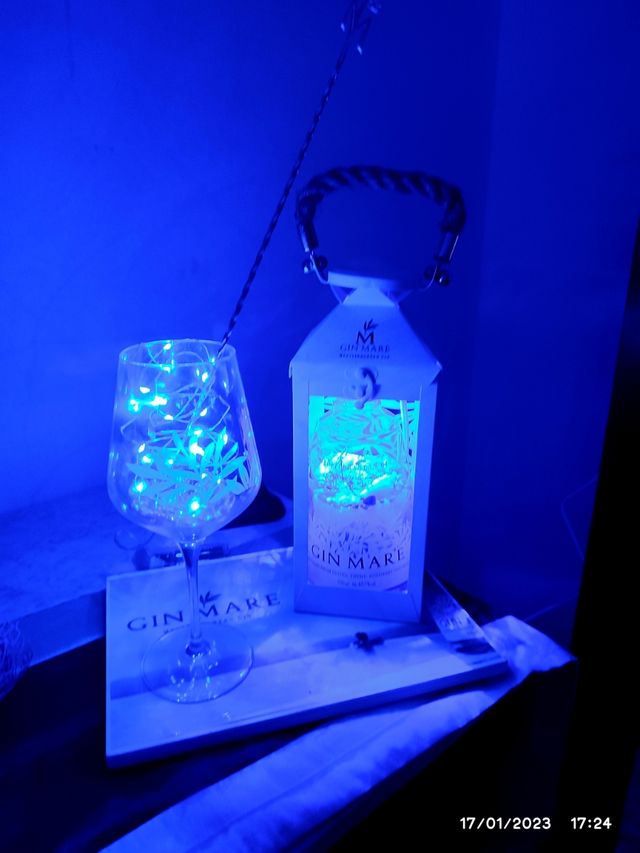 lampada con lanterna e Calice gin mare base in legno , decorazioni interne.