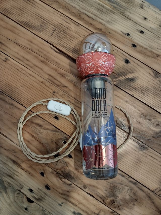 lampada creata con bottiglia di gin italiano. lampadina a filamento ambrata. cavo in tessuto color ecrù