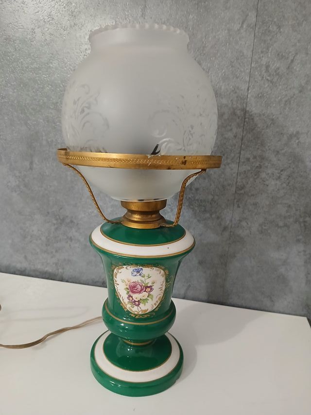 Antica Lampada ad Olio Elettrificata in Ceramica Ottone e Vetro Verde Vintage In buone condizioni come da foto