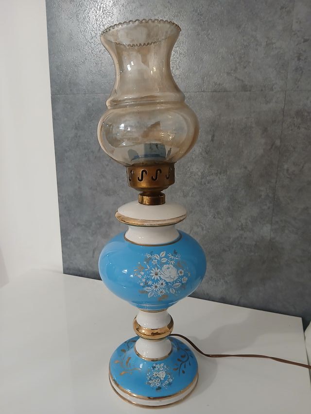 Dettagli del prodottoBellissima lampada da tavolo vintage, in ceramica, di colore azzurro chiaro con dettagli oro. Ideale per un tocco retrò nella tua casa!