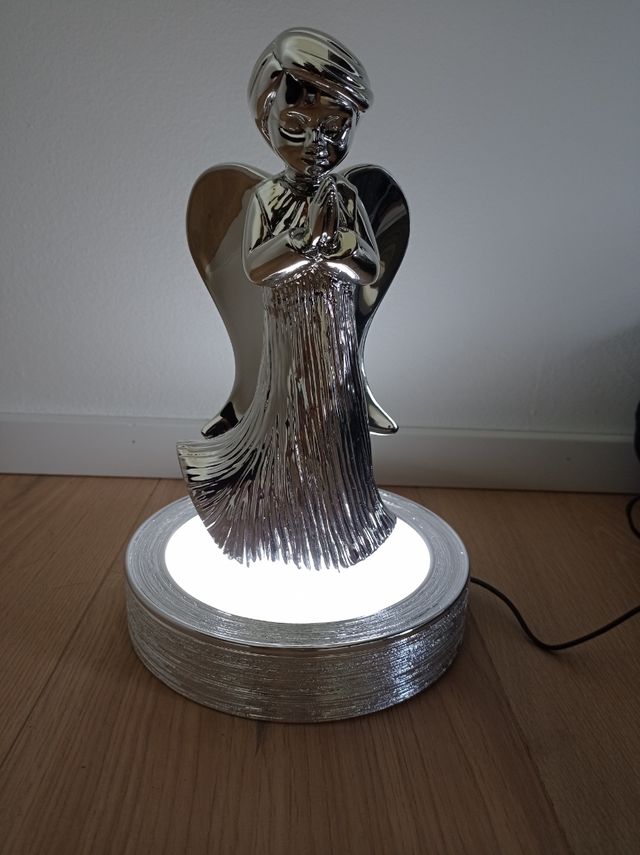 Dettagli del prodottoLampada al led con angelo realizzata in resina con laminatura argento.