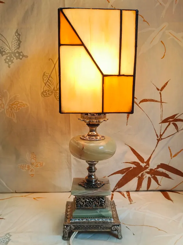 Lampada da tavolo Tiffany vetro,metallo e onice