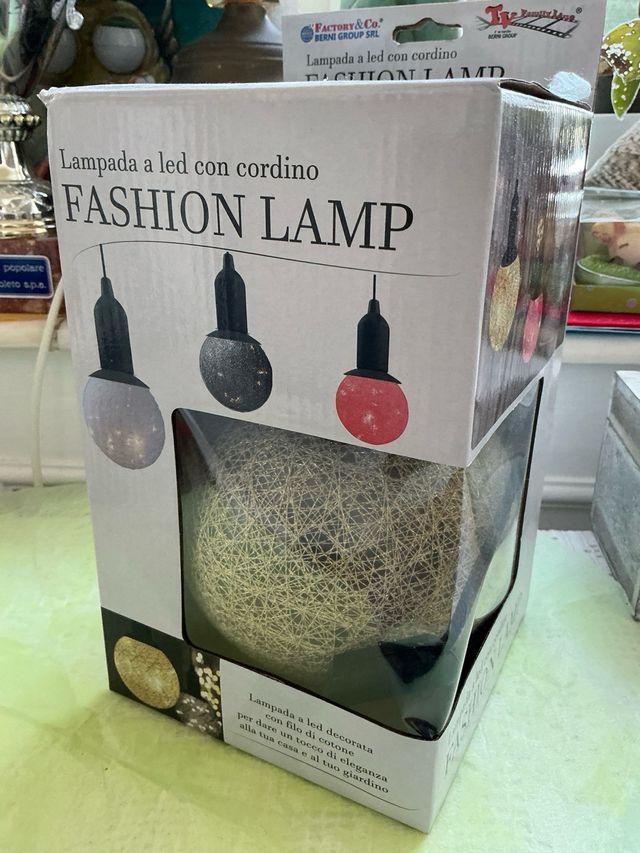 Dettagli del prodottoSet di due lampade. Fashion Lamp a led. Lampada a led che funziona senza energia elettrica, funziona con batterie e si attiva tirando una corda lunga 100 cm. Si può appendere e usare in luoghi in cui non arriva l'elettricita'. Lampadina di diametro 10 cm decorata con filo di cotone dorato intrecciato Effetto elegante Funziona con 3 batterie AAA. Colore: oro. Una sola scatola