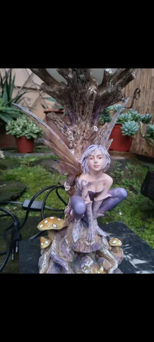 Dettagli del prodottoLampada decorativa con una fata LES alpes. La base è ispirata a un tronco d'albero con funghi.