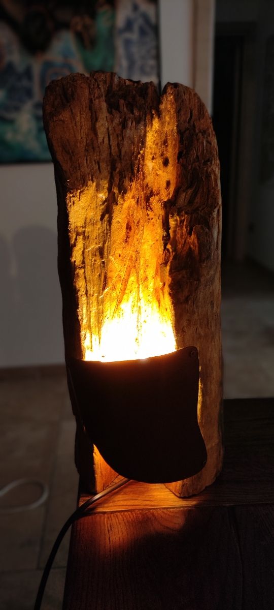 Dettagli del prodottovendo lampada artigianale, parte illuminante è all' interno del legno con effetto luce diffusa, creando un ambiente rilassante. attacco lampada E27, materiali utilizzati legno e piastra in alluminio. dimensioni: 40cm altezza e diametro circa 20cm. Misure del prodotto