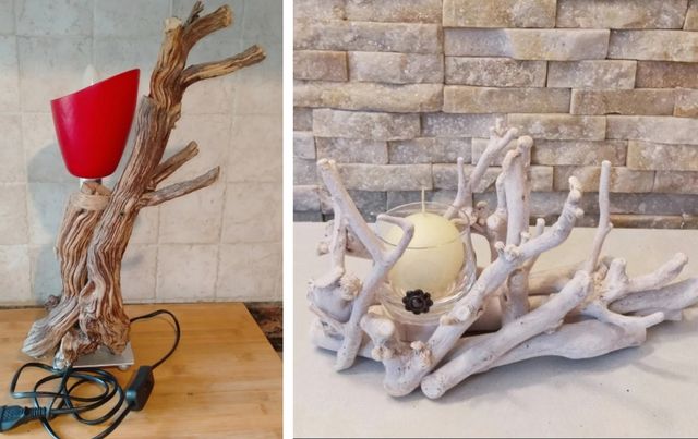 Dettagli del prodottoParticolare e unica lampada da tavolo artigianale realizzata con veri legni naturali di vite, il paralume tulipano in vetro incamiciato rosso con interno bianco, base in metallo acciaio.