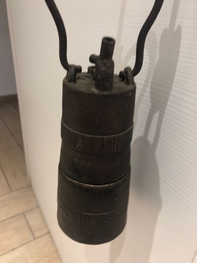 Lampada antica da minatore, un pezzo di storia. - Materiale metallico scuro. - Design cilindrico con dettagli a rilievo.