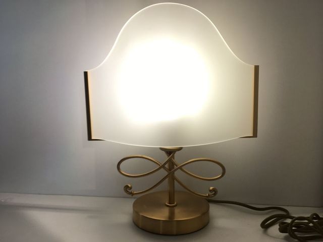 Lampada da tavolo in ottone lucido con diffusore in vetro curvo satinato.