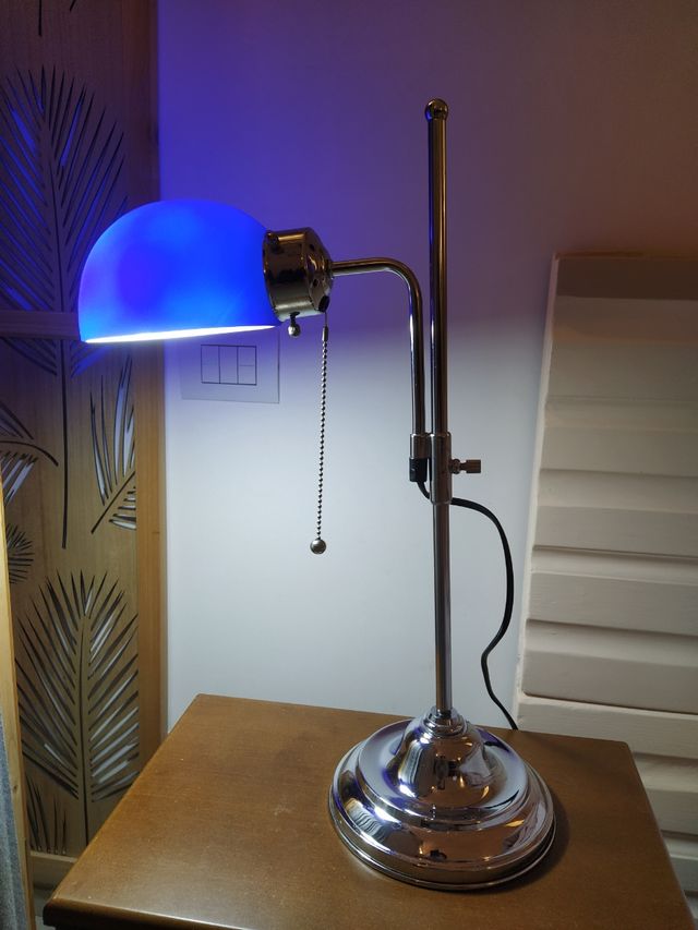 Dettagli del prodottoLampada presidenziale modello Churcill usata come complemento d'arredo da scrivania. Ideale per abbellire uno studio o un soggiorno. Materiale prevalente acciaio e paralume in vetro di colore blu. Perfettamente funzionante e l'accensione avviene tramite catenella. Misure larghezza base 17 cm, altezza 48 cm