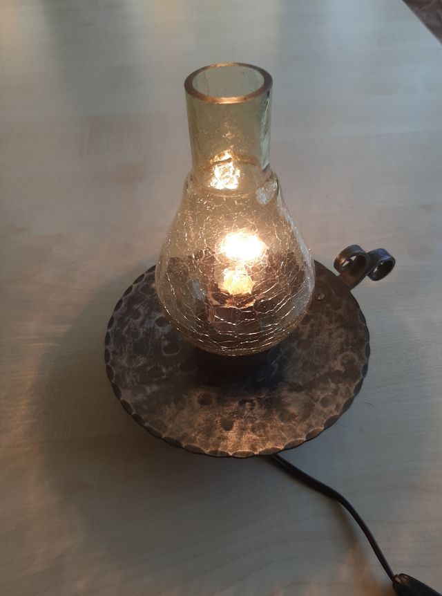 Lampada da tavolo con base in ferro alta 19 cm e paralume in vetro lavorato . Filo, interruttore e completa di lampadina. Funzionante