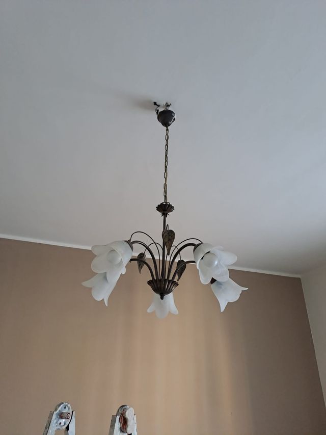 lampadario con sospensione in ferro battuto con lampade in vetro bianco satinato