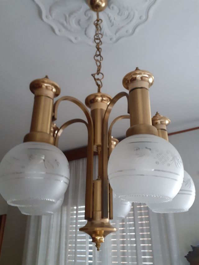 lampadario anni 60, con 5 bocce bianche satinate con disegno, con struttura in ottone dorata, tenuto bene