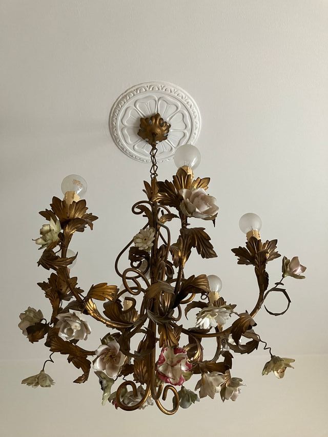 Lampadario da soffitto di ottone dorato e fiorellini in porcellana. 6L. Va abbinato all'applique di ottone.