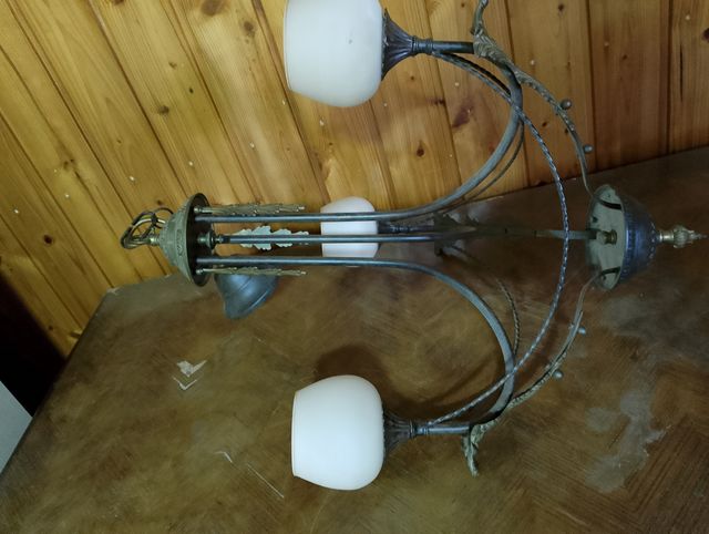 lampadario ferro con coppe in vetro colore rosa antico tre luci
