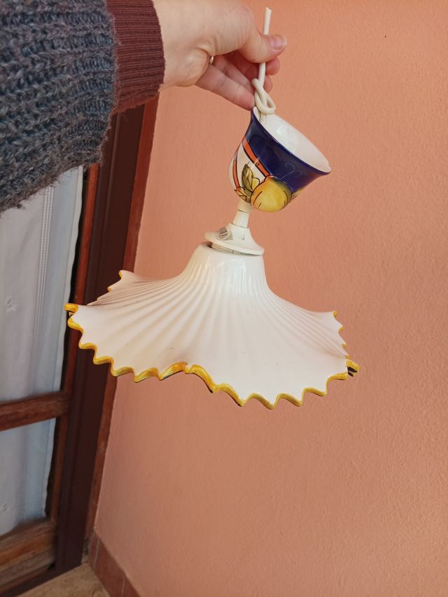 Dettagli del prodottoLampadario in ceramica dipinto adatto in cucina. Diametro cm 30. È in ottime condizioni, solo una piccola scheggiatura alla base che va sul soffitto, facilmente riparabile con un po' di colore.