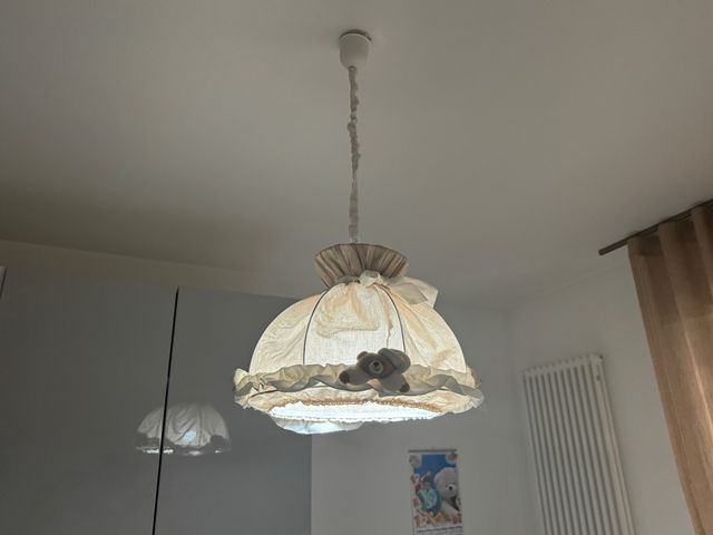 Lampadario originale Nanán, perfetto per una cameretta. - Tessuto color crema. - Decorazione con orsetto e fiocco. - Finitura con volant e pizzo.