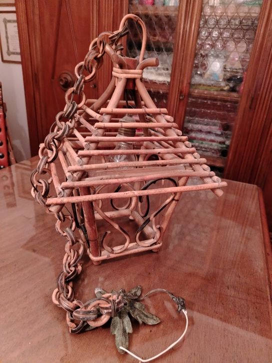 Lampadario da esterni vintage in vimini con gancio in metallo,rustico,altezza(senza catena):42 cm,lunghezza catena:72 cm,ingombro orizzontale:29 cm,in ottime condizioni.Molto carino!