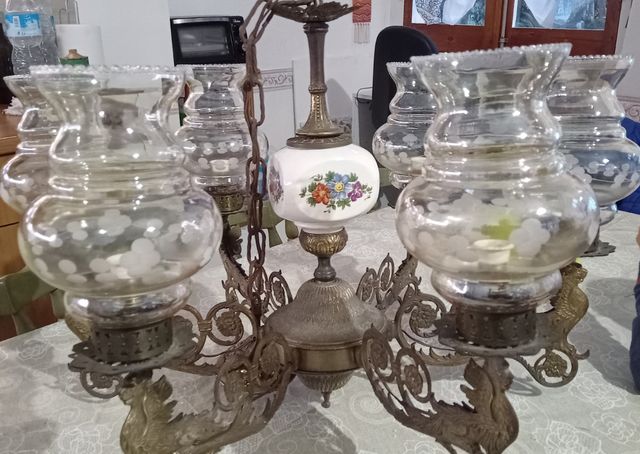lampadario vintage anni 60 in ottone con 6 plafoniere in vetro ambrato decorazioni con leoni alati in ottime condizioni Misure del prodotto