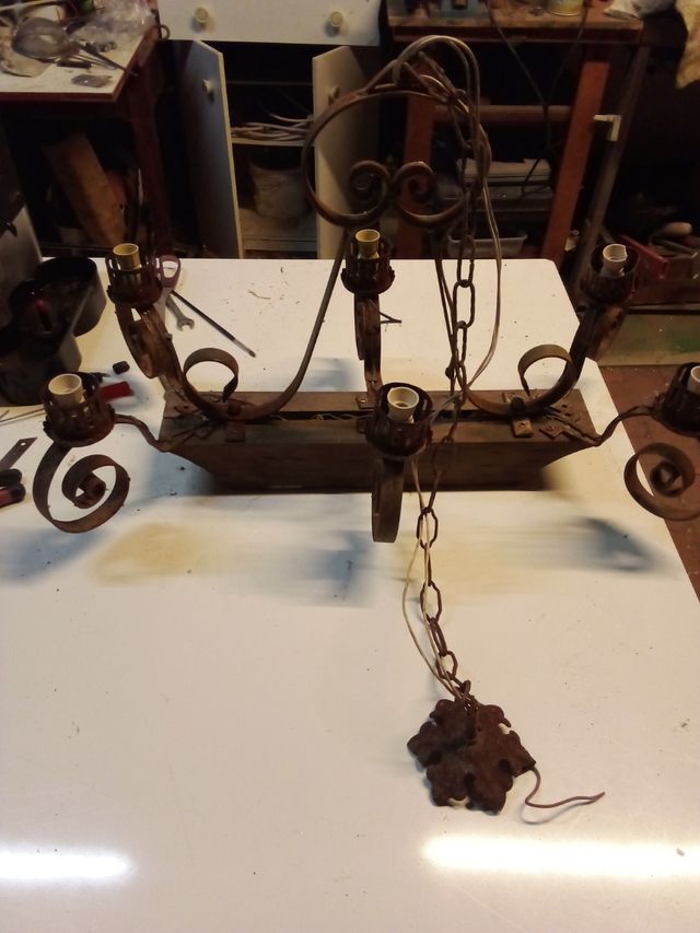 Lampadario Vintage In Legno E Ferro Da Restaurare.