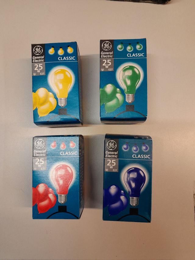 Lampadine E27 25W rosso giallo blu e verde. Disponibilità: rosso nr 6; giallo nr 12; blu nr 7; verde nr 3 Il prezzo indicato è per singola lampadina